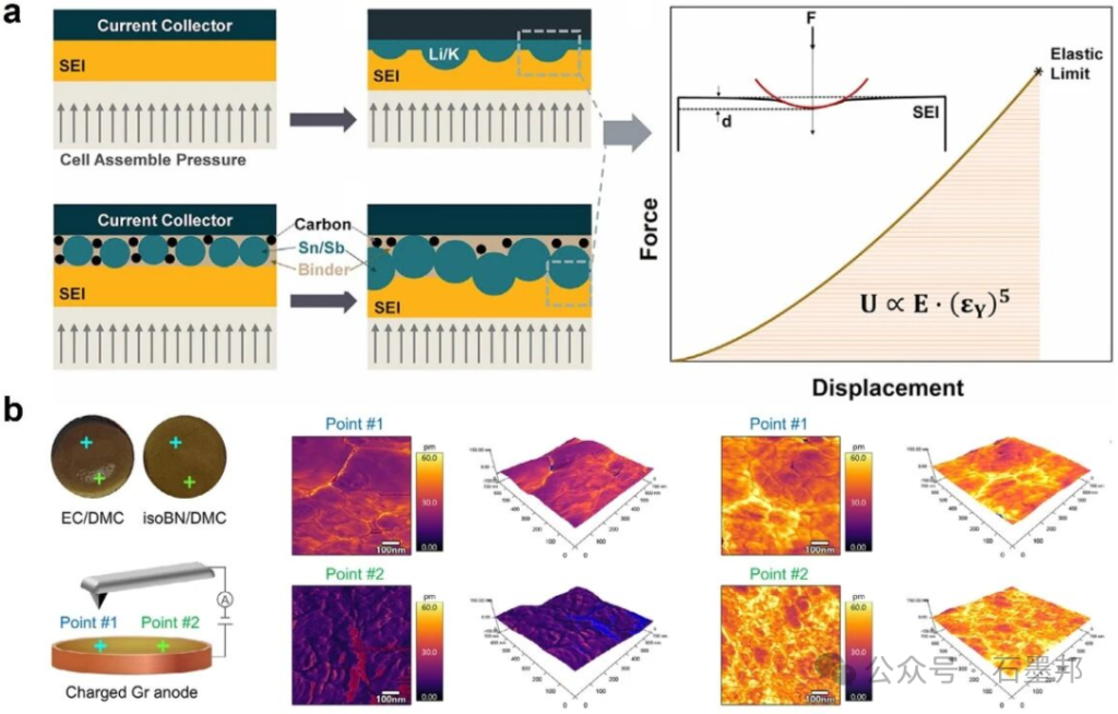 Repeated Li+ insertion and extraction cause volume expansion and contraction of the graphite anode, generating mechanical stress within the SEI (Sediment Injection Layer). When the stress exceeds the SEI’s strain tolerance, the SEI fractures, exposing fresh electrode surface to the electrolyte and triggering side reactions that regenerate the SEI, ultimately accelerating battery capacity decay. Therefore, the mechanical stability of the SEI is crucial to battery performance, requiring rigorous characterization of its mechanical properties.
