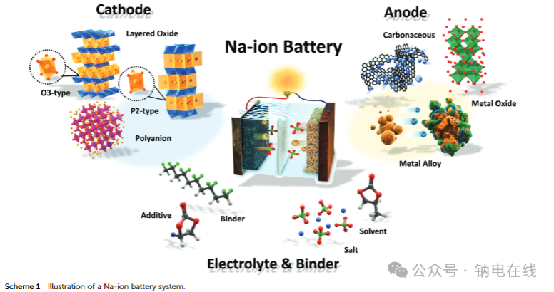 Sodium-ion batteries, as a potential alternative to lithium-ion batteries, possess broad application prospects in areas such as large-scale energy storage due to their core advantages of abundant sodium resources and low cost. This review comprehensively summarizes the current research status of materials for sodium-ion batteries. Regarding cathode materials, layered transition metal oxides and polyanionic compounds each have their advantages and disadvantages. O3-type layered materials have greater practical potential due to their structural similarity to commercial lithium-ion battery cathodes, while P2-type materials, although having higher capacity, require addressing the issue of initial cycle Coulombic efficiency. Among anode materials, hard carbon remains the mainstream choice due to its low potential and long cycle stability, while high-capacity conversion-type and alloying-type materials require structural design to mitigate volume expansion issues. Optimization of electrolytes, additives, and binders is crucial for improving battery performance; suitable electrolyte formulations can reduce interfacial reactions, additives such as FEC can improve SEI film stability, and water-soluble binders are more environmentally friendly and cost-effective.